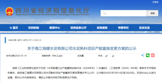 3月14日,四川省經濟和信息化廳發布《關于南江海螺水泥有限公司水泥熟料項目產能置換變更方案的公示》稱:按照《工業和信息化部關于印發〈水泥玻璃行業產能置換實施辦法(2024年本)〉的通知》(工信部原〔2024〕206號)等有關文件規定和要求,現將南江海螺水泥有限公司水泥熟料項目產能置換方案變更情況予以公示,公示期為2025年3月14日至3月28日。歡迎社會公眾進行監督,若對公示內容有異議,請在公示期內向經濟和信息化廳反映。