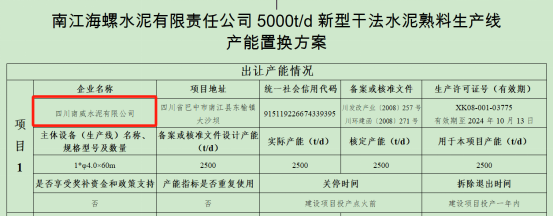 巴中海螺水泥有限責任公司原備案核準設計產能為4500噸,置換后總產能為6166t/d,置換指標產能為2500t/d,置換產能1666t/d。