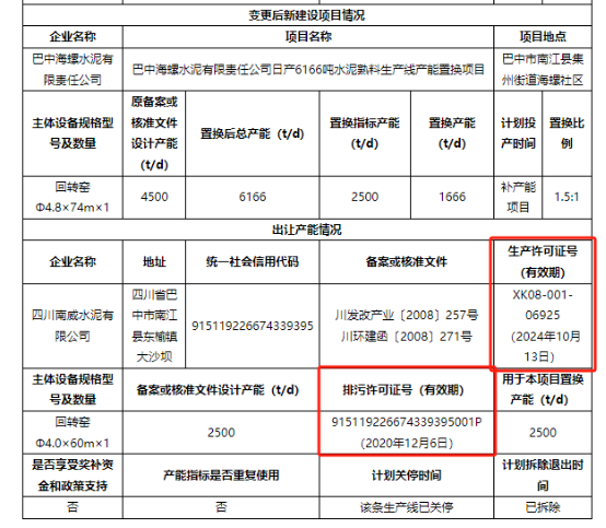 本次置換方案中,出讓方四川南威水泥有限公司生產許可證有效期至2024年10月13日,排污許可證有效期至2020年12月6日,截至本次變更方案公示,四川南威水泥有限公司生產許可證已過期5個月,排污許可證過期已超過4年。
