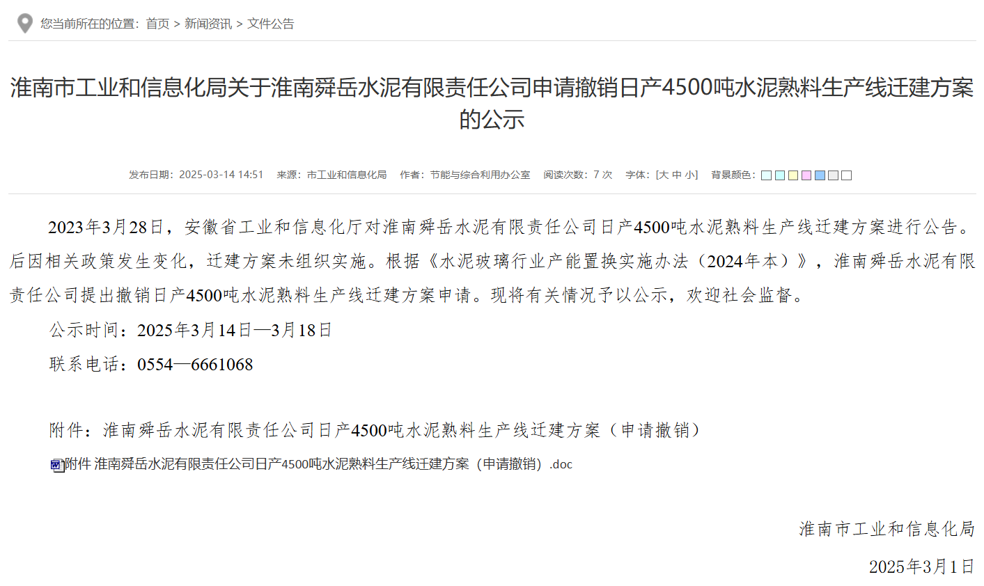 日前,安徽淮南市工業(yè)和信息化局發(fā)布《關于淮南舜岳水泥有限責任公司申請撤銷日產4500噸水泥熟料生產線遷建方案的公示》稱,2023年3月28日,安徽省工業(yè)和信息化廳對淮南舜岳水泥有限責任公司日產4500噸水泥熟料生產線遷建方案進行公告。后因相關政策發(fā)生變化,遷建方案未組織實施。根據《水泥玻璃行業(yè)產能置換實施辦法(2024年本)》,淮南舜岳水泥有限責任公司提出撤銷日產4500噸水泥熟料生產線遷建方案申請。現將有關情況予以公示,歡迎社會監(jiān)督。公示時間:2025年3月14日—3月18日聯系電話:0554—6661068.