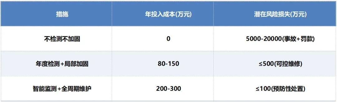 從水泥廠構筑物的結構安全方面綜合考慮,如果水泥不定期進行構筑物的檢測,就會造成一系列安全隱患,嚴重會導致發生安全事故,進而影響水泥企業的安全運營,不僅會給水泥廠金錢方面的損失,更會給水泥廠帶來極大的商譽損失。為了減少水泥企業的損失,匯朗建設為為各大水泥廠算了一筆賬。