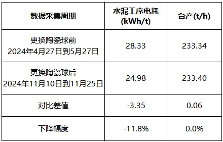 在柳州二線2#水泥粉磨系統改造中,通過優化特種陶瓷球級配方案,在保持原有233.4t/h臺產水平的基礎上,成功將工序電耗從28.33kWh/t降至24.98kWh/t,降幅達11.8%,超額完成合同約定的3kWh/t節能目標。更值得關注的是,在產量零損失的情況下,單月即可節省電能超50萬千瓦時,折合標準煤約60噸,環保效益顯著。