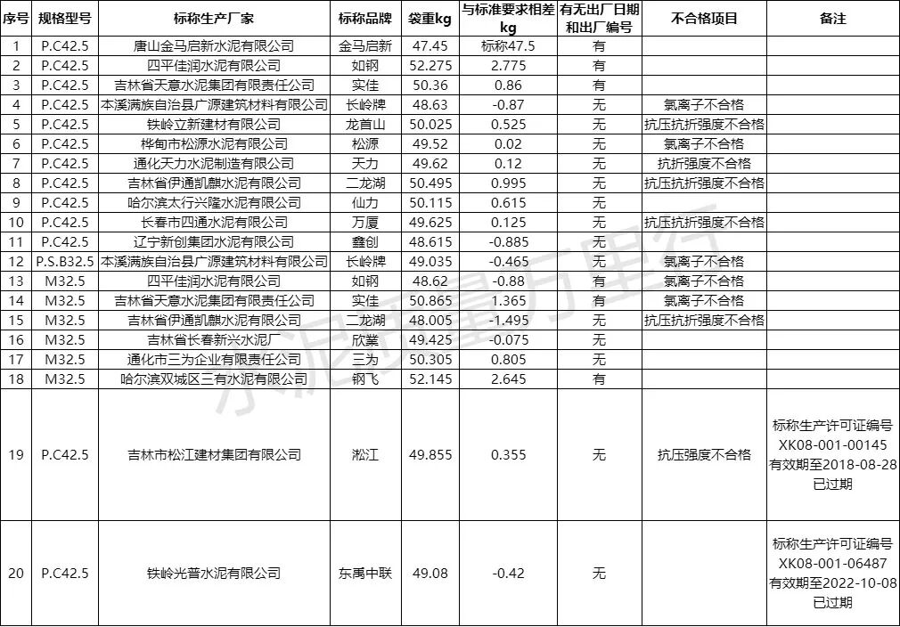 更值得警惕的是,部分產品存在“多重不合格”問題。例如本溪滿族自治縣廣源建筑材料有限公司生產的“長嶺”牌P.C42.5、P.S.B32.5各一批次產品,不僅氯離子不合格,同時存在袋重不足;四平佳潤水泥有限公司的一批次“如鋼”牌M32.5水泥也出現氯離子超標與袋重不足并存的情況,這類產品的質量風險更為集中。